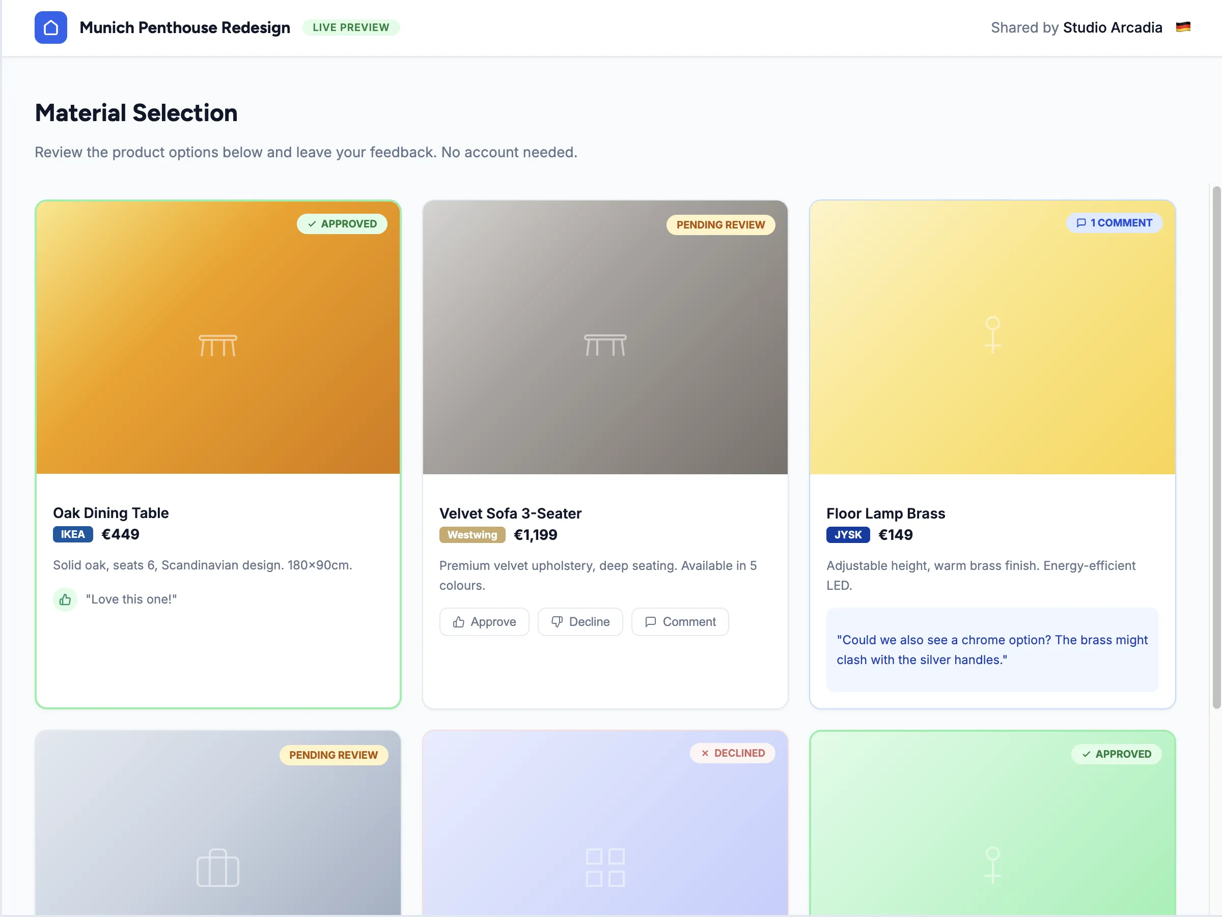 Share any project stage with clients via a unique link. They browse product selections, leave feedback on individual items, and approve — without creating an account or installing anything.