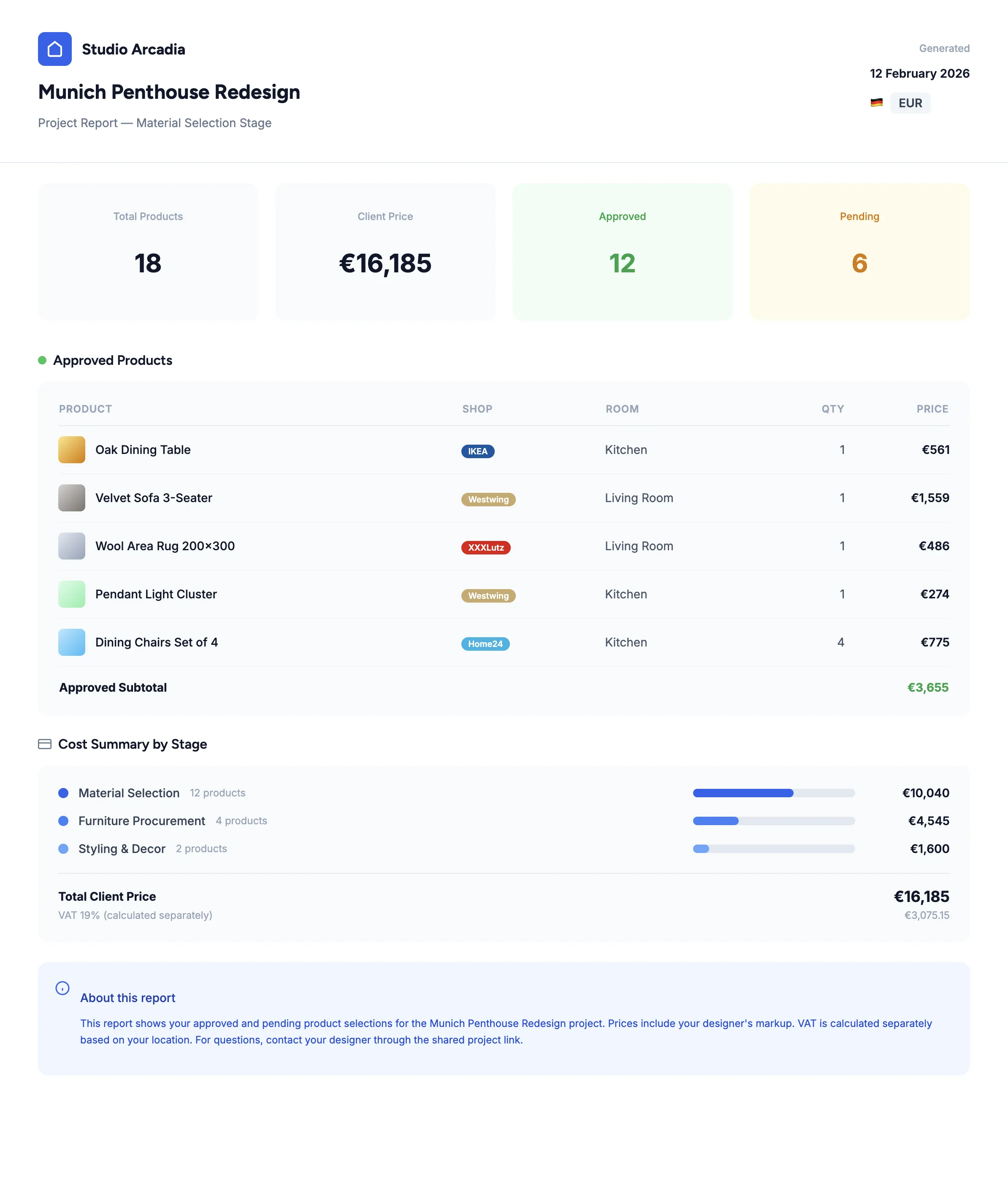 Client proposals automatically show product images, descriptions, and your final prices. Your supplier costs and markup are never included. You can choose which products and stages to include.